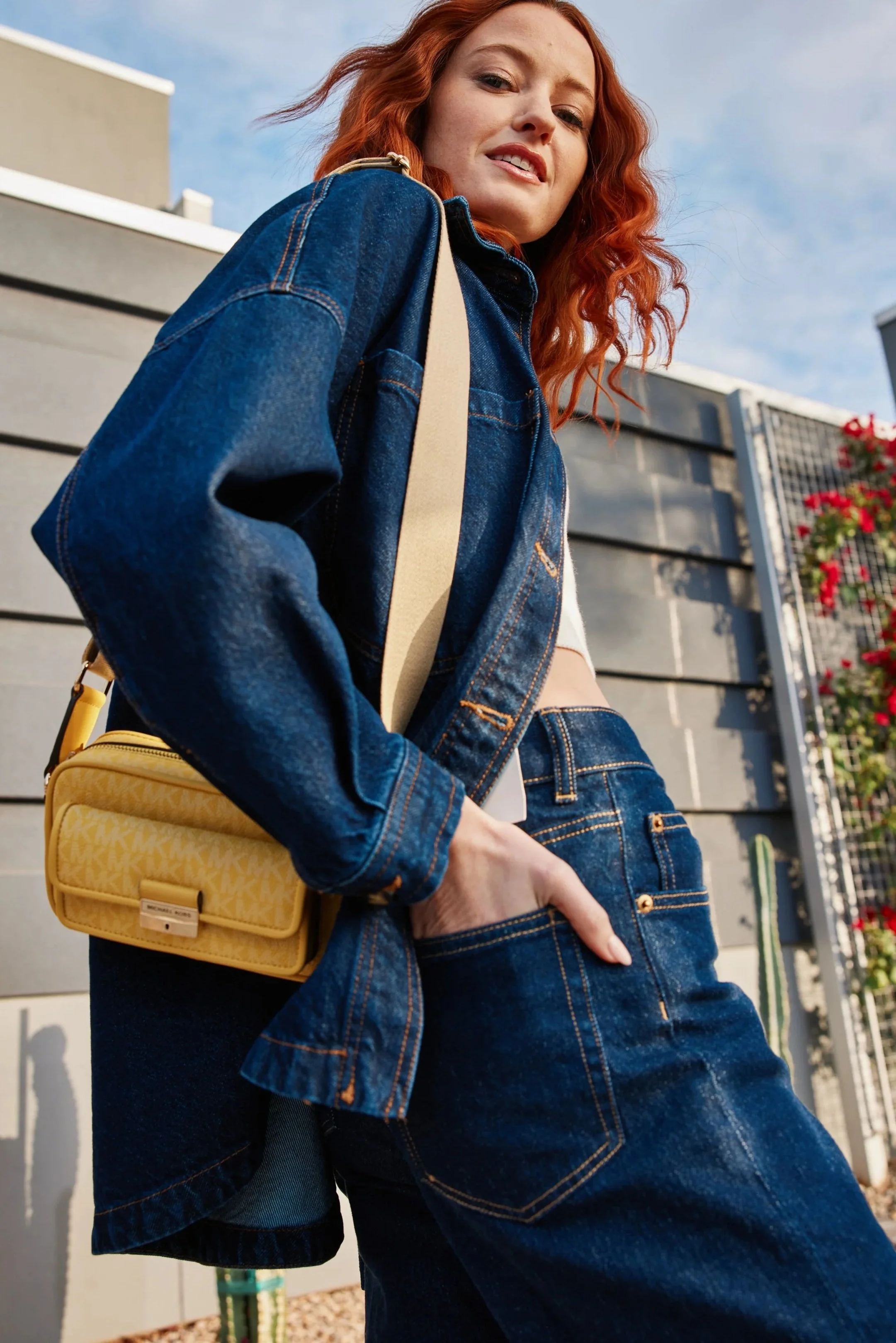 A young woman with red curly hair wearing a denim jacket and jeans, carrying a yellow purse, standing outdoors against a modern building with a blue sky in the background.