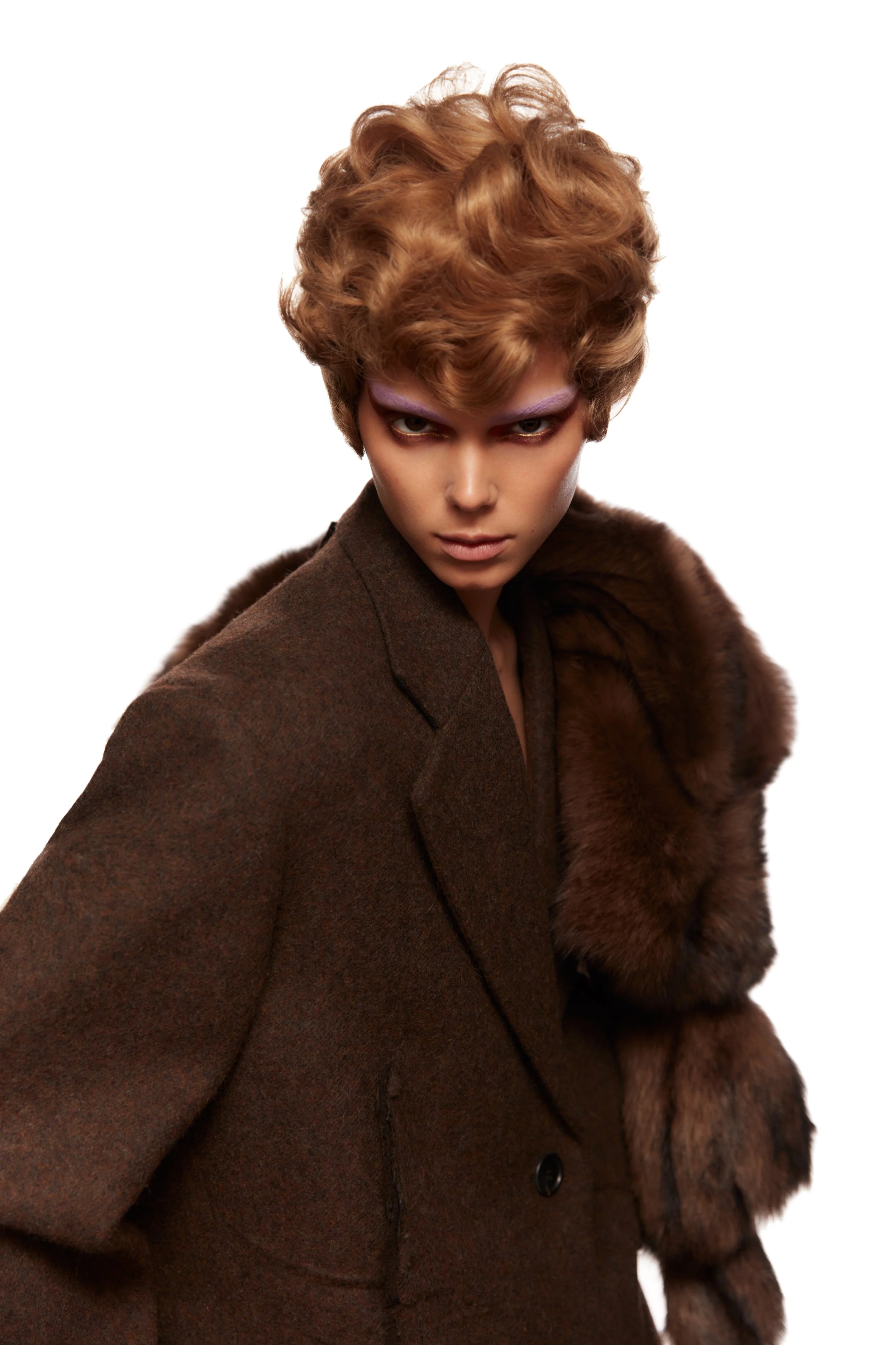 A woman with short, curly, red hair is wearing a brown coat with a fur collar, looking intensely at the camera with a serious expression.