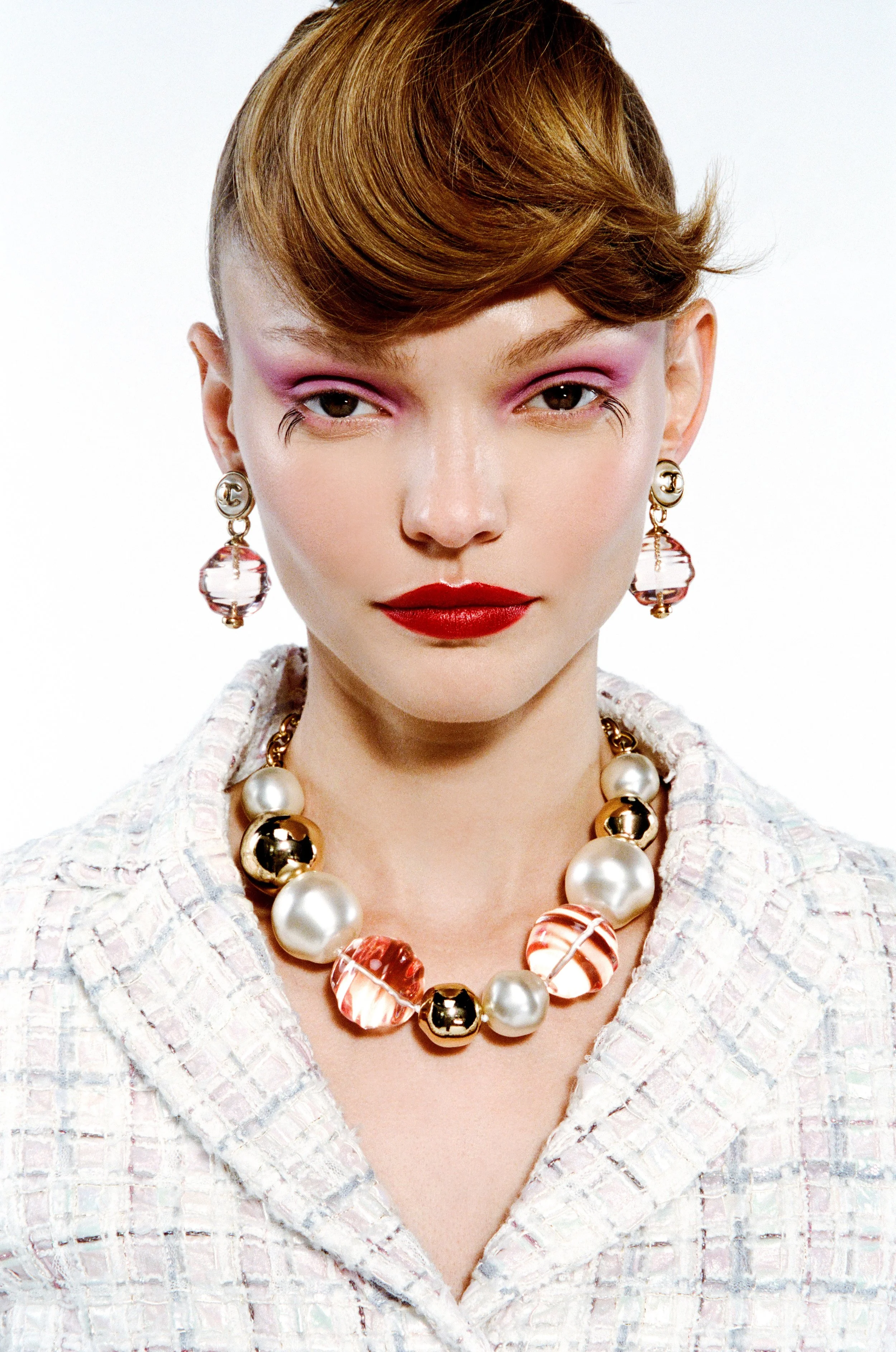A woman with short, styled hair wearing bold makeup, red lipstick, and jewelry including large pearl and gold beads on a necklace and pink, black, and pearl earrings.