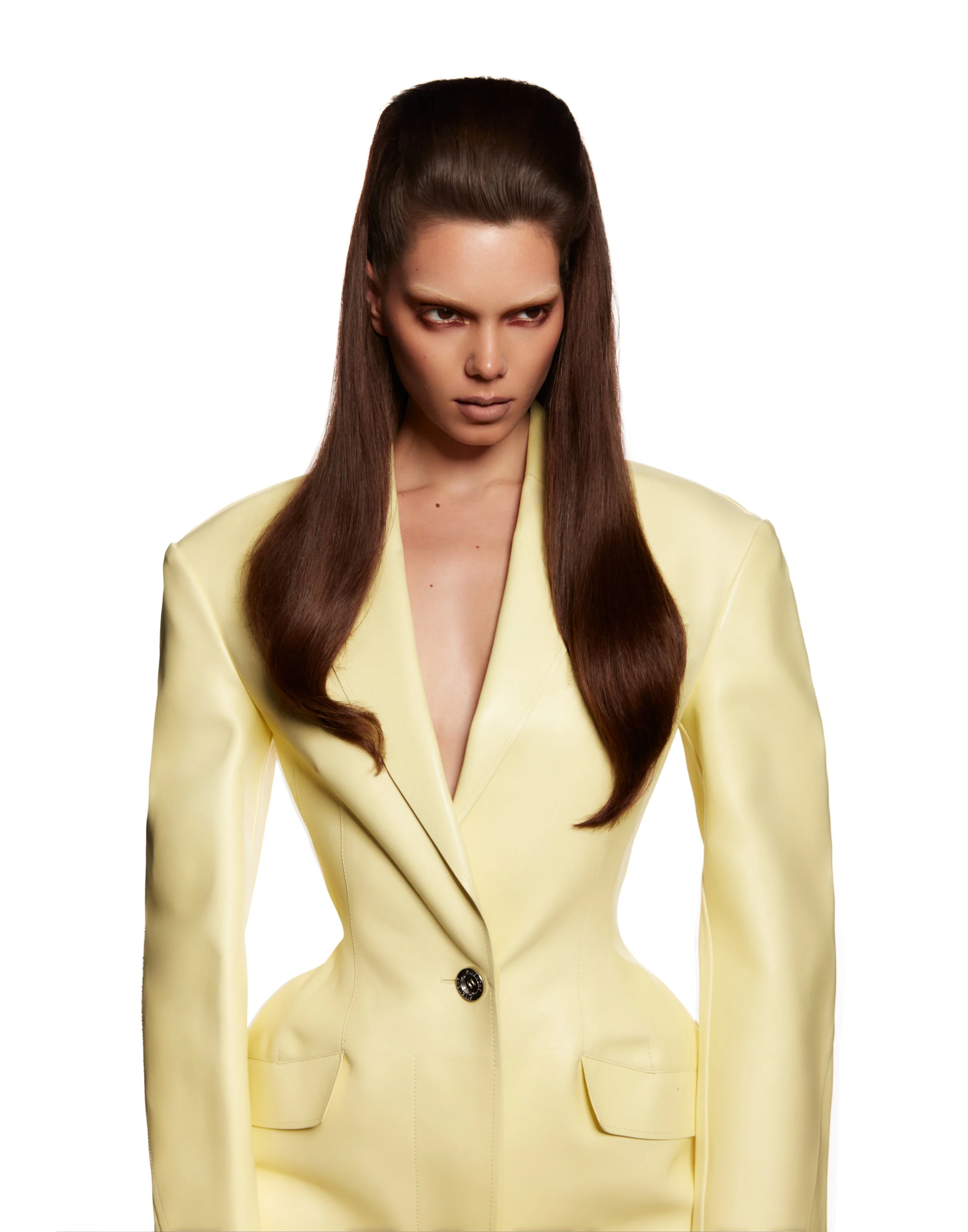 A woman with long brown hair styled in a vintage look, wearing a pale yellow blazer with a deep neckline, looking intensely at the camera.
