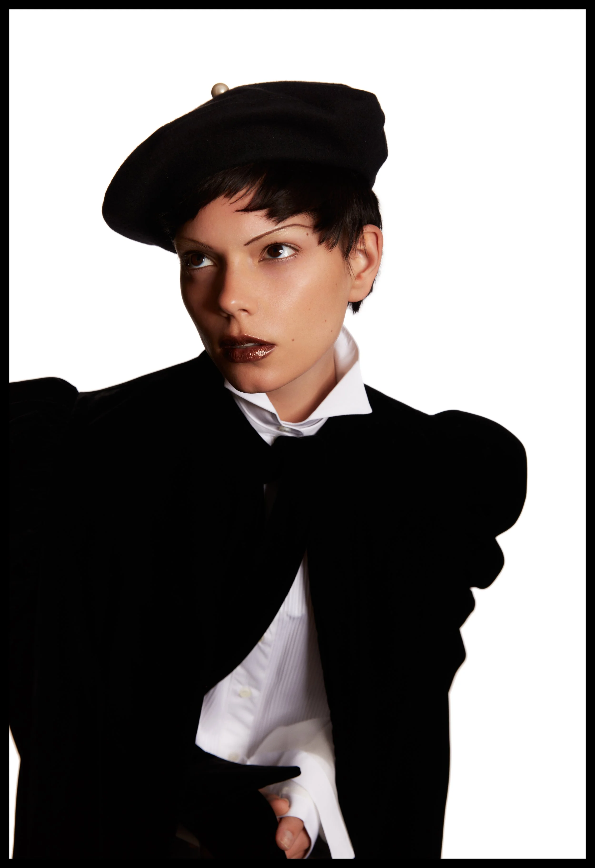 A woman with short dark hair wearing a black hat, black jacket, and white shirt, looking to the side against a white background.