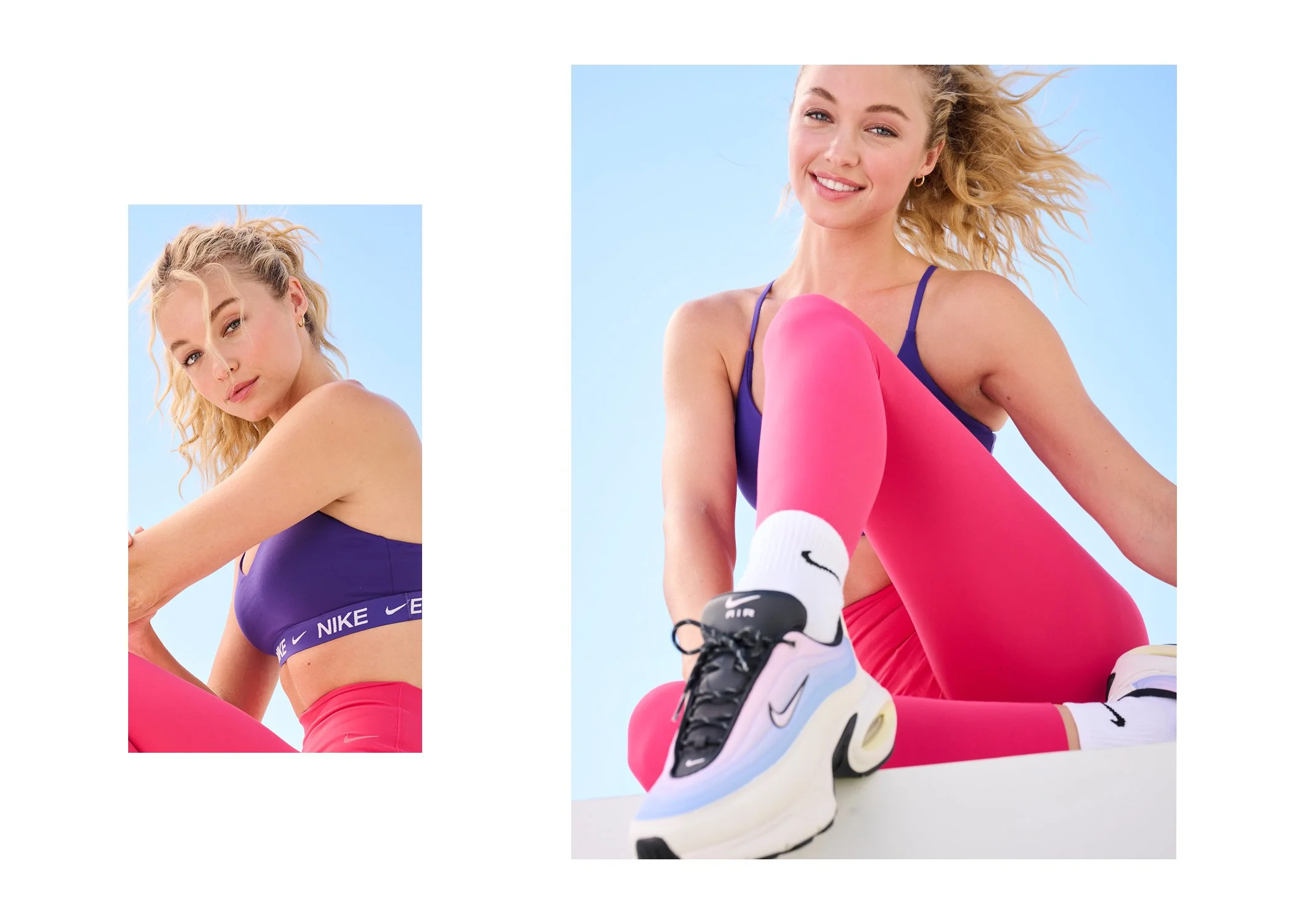 Two women dressed in athletic wear, one in a purple Nike sports bra, pink leggings, and white Nike sneakers, sitting on a white surface against a light blue background. The other woman is in a similar purple sports bra, pink leggings, and sneakers, smiling and sitting with one knee raised.